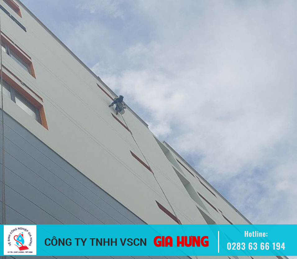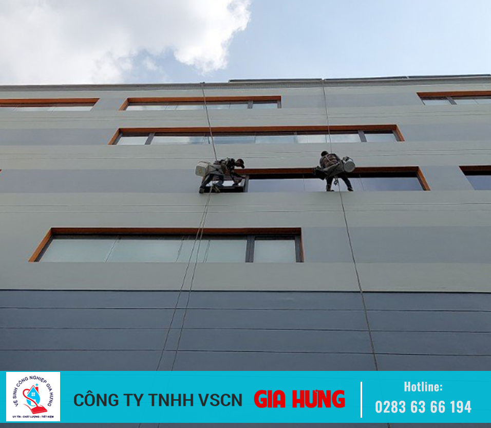 - Khu vực bên ngoài: Đối với các toà nhà cao tầng, khách sạn hay các công trình có phần diện tích tường hoặc kính ở bên ngoài lớn, việc vệ sinh, bảo trì đòi hỏi phải có những thiết bị chuyên dụng như hệ thống thang, dây đu và đội ngũ nhân viên được đào tạo bày bản, có kinh nghiệm làm việc. Có như vậy, bề mặt kính sẽ được làm sạch hoàn toàn cũng như đảm bảo an toàn lao động. Việc vệ sinh kính bên ngoài tòa nhà nên làm định kỳ 4 - 6 tháng sẽ giúp kính và Alu được bảo trì tốt nhất, tránh tình trạng kính và Alu bị oxy hóa vảy nến ăn sâu vào bên trong và không thể vệ sinh sạch hết được. Việc thay thế kính là hết sức tốn công sức, thời gian và tiền bạc. Vì vậy Dịch vụ lau kính GIA HƯNG rất mong các Quý khách có kính mặt ngoài nhiều hết sức lưu ý.