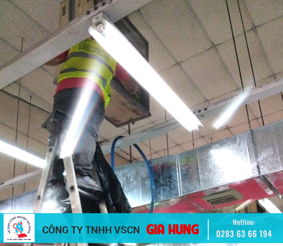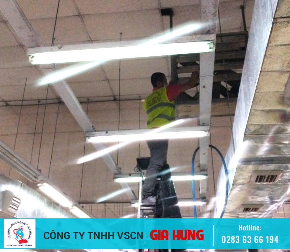 - Tiến hành làm sạch bụi bẩn và mạng nhện bám trên trần nhà, trên thanh đà, thanh ti nối dài, thanh sắt đứng, lưới chắn chôn trùng, hệ thống thông gió, quạt trần, cáp treo, hệ thống chiếu sáng…